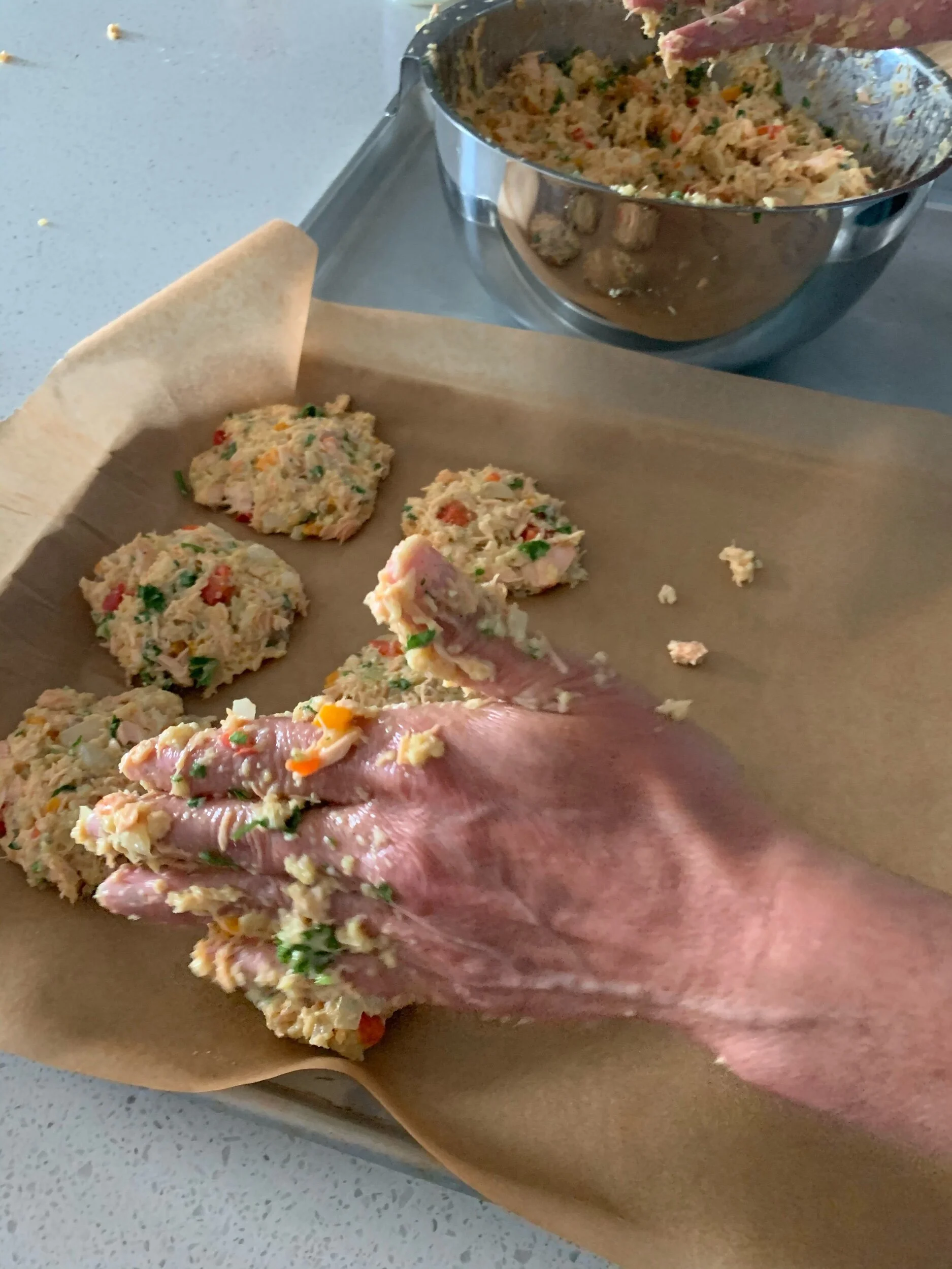 9) Form into 1/3 to 1/2″ thick patties. To do this, take a portion of mixture that is slightly larger than a golf ball. Place the ball on the parchment and flatten.