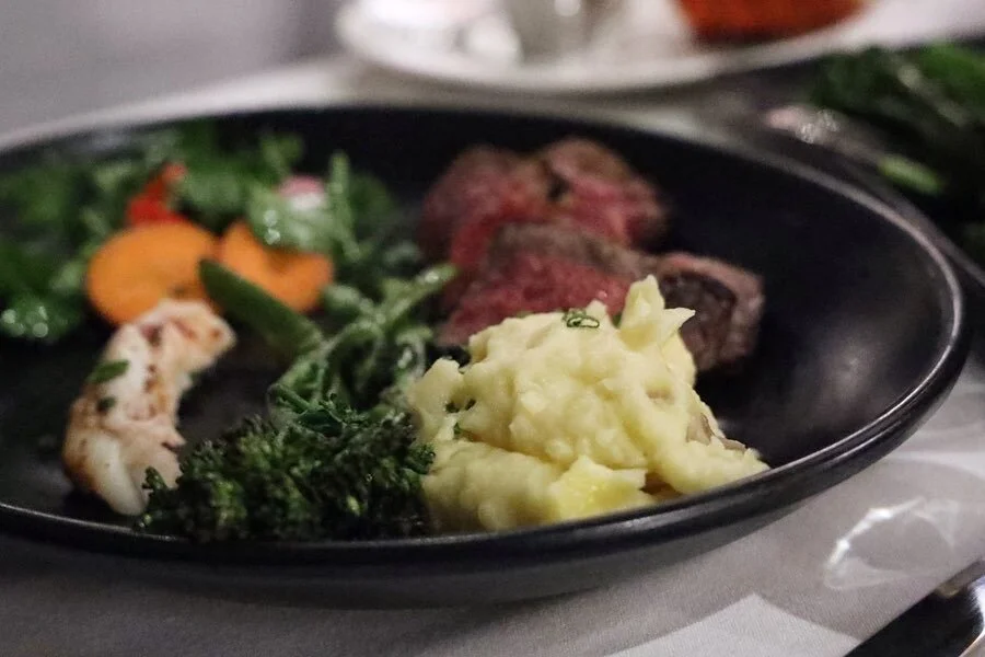 We split the 36oz Prime Porterhouse ($95) – Medium Rare. On one side of the bone is a NY Strip and the other side is a filet. There was an excellent char on the outside. It was not too overpowering and revealed beautifully tender meat inside. It was cooked perfectly: just above rare. I loved that they carved the meat tableside. We received two sides: the Yukon gold mashed potatoes come standard, and then we chose the broccolini in a lemon vinaigrette as our second side. We also added a 5oz lobster tail ($18) to our meal – which was very tender and flavorful.